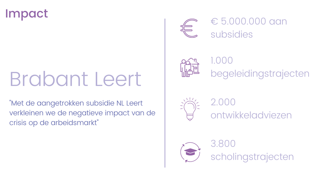 Met de subsidie krijgt BrabantLeert een stevige impuls voor de uitvoering van 2.000 ontwikkeladviezen, 1.000 begeleidingstrajecten en 3.800 scholingstrajecten voor werkenden en werkzoekenden in Noord-Brabant.