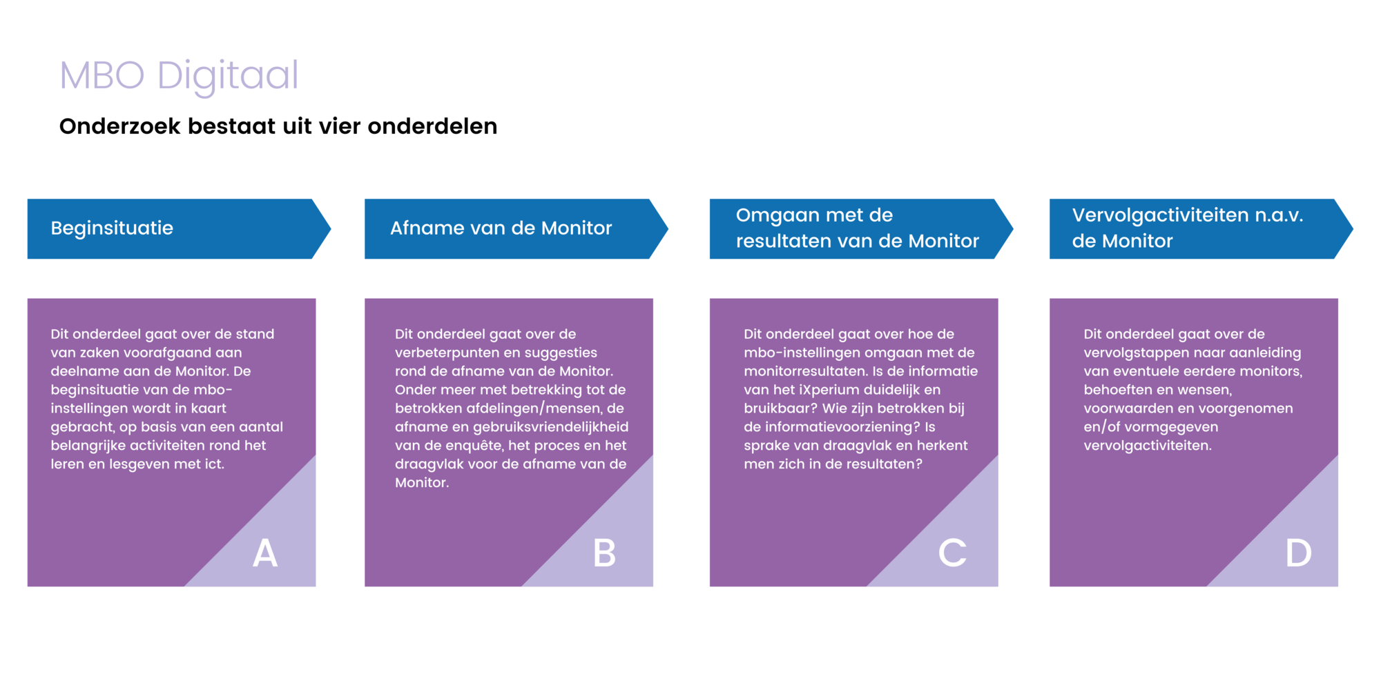 Om in kaart te brengen hoe docenten en instructeurs lesgeven met en over ict en in hoeverre ze beschikken over de benodigde competenties, is sinds 2016 de 'Monitor Leren en lesgeven met ict' door het iXperium Centre of Expertise afgenomen bij diverse mbo-instellingen. Het iXperium is verbonden aan het lectoraat Leren met ict van de Hogeschool Arnhem/Nijmegen (HAN). In samenspraak met het ministerie van OCW, de MBO Raad, MBO Digitaal en het programma Doorpakken op Digitalisering is de monitor in 2022 landelijk opgeschaald. In totaal hebben in 2022 meer dan 6.000 docenten en 32 mbo-instellingen deelgenomen aan de monitor, in de vorm van een online vragenlijst.