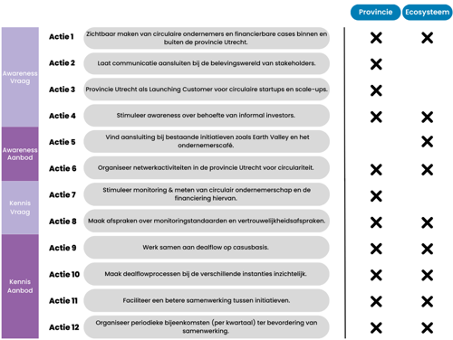 Op basis van de bevindingen in ons onderzoek, zijn er twaalf aanbevelingen geformuleerd als acties aan de provincie Utrecht en stakeholders in het ecosysteem (zie figuur). Met de voorgestelde acties heeft de provincie handelingsperspectief om, samen met het ecosysteem, circulair informal investing aan te jagen.