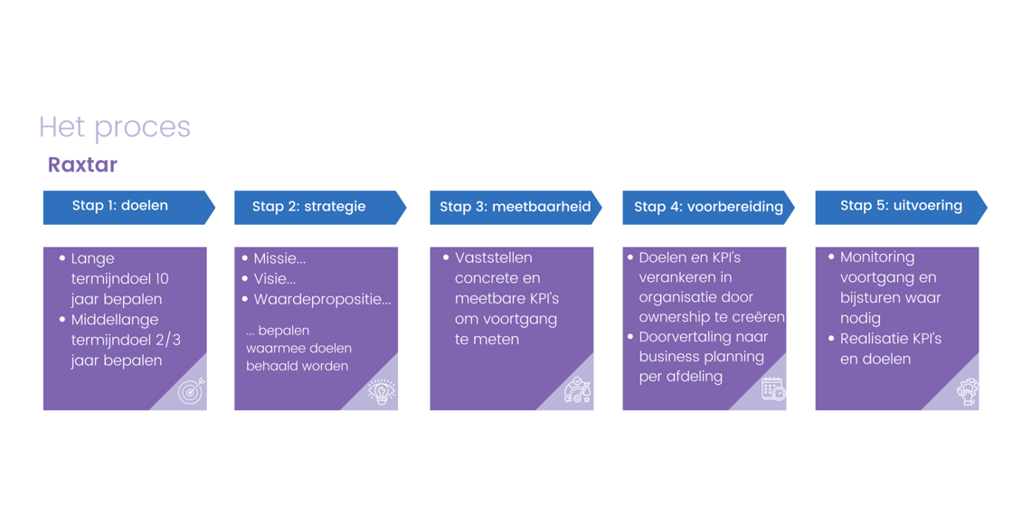 We hebben RAXTAR begeleid aan de hand van een vast stappenplan. Na het scherpstellen van de kaders, doorliepen we de bovenstaande stappen met ze: