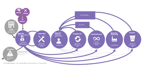 De genoemde percentages in bovenstaande figuur zijn ten opzichte van de Put On Market. De paarse gegevens vallen binnen dit onderzoek. Ten opzichte van de Put On Market wordt 12% hergebruikt, 8,5% gerepareerd en 0.3% refurbished. Verder wordt 20% van de verkochte EEA hoogwaardig verwerkt en 7% verwerkt door middel van recovery.