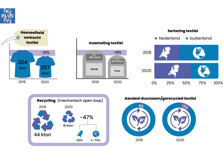 Niet alleen bij de verkoop en inzameling is een sterke daling te zien, maar ook bij de recycling van textiel. Momenteel wordt er vooral nog gebruik gemaakt van mechanische open loop recycling, wat inhoudt dat het gerecycled wordt in een niet-vergelijkbare toepasbare toepassing, zoals een poetsdoek, of autostoelvulling. Dit is circa de helft minder gedaan in Nederland ten opzichte van 2018.