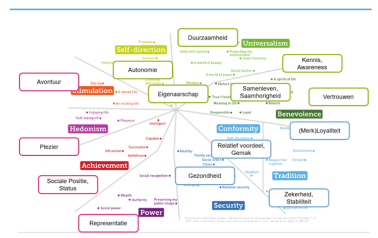 Intrinsieke motivatie biedt kansen voor lange termijn. De sleutel naar nieuw gedrag is kijken en aansluiten op deze vorm van motivatie. Het Waardenkompas, ontwikkeld door TNO, biedt een overzicht van waarden die deel kunnen zijn van specifiek intrinsieke motivaties, zie figuur 1.