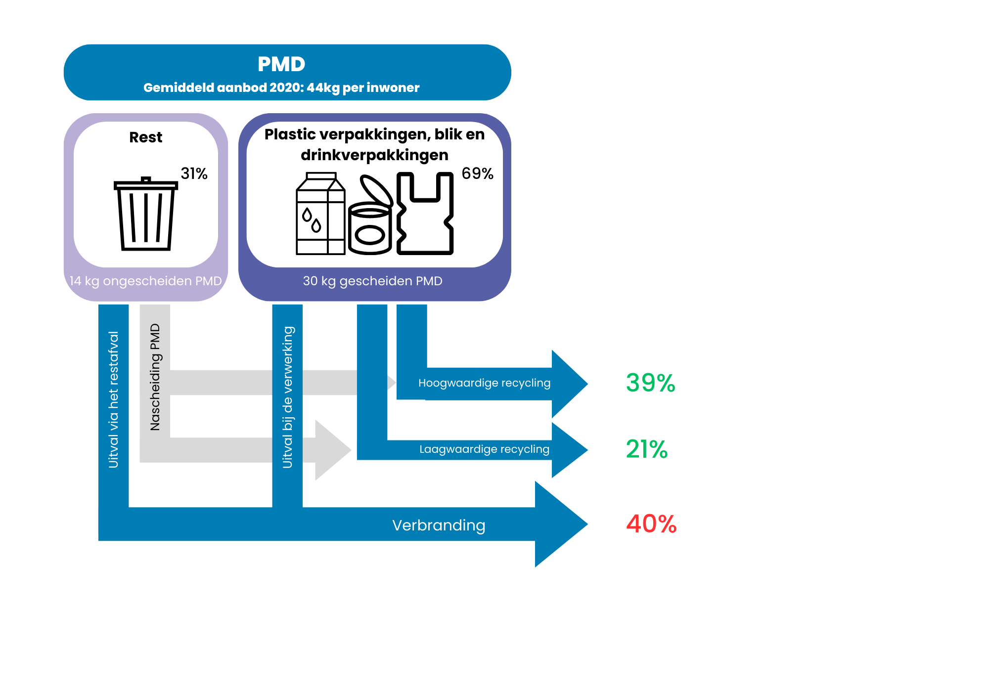 Er is dus werk aan de winkel om de hoeveelheid her te gebruiken kunststofafval te vergroten. Momenteel gaat namelijk nog steeds een groot deel verloren doordat het niet apart of met de juiste kwaliteit wordt ingezameld, door beperkte recyclingefficiëntie en de aanwezigheid van bepaalde kunststofstromen die we op dit moment nog niet goed kunnen recyclen. In Figuur 1 is zichtbaar hoeveel PMD er verloren gaat in het inzameling- en recyclingproces. Ben je nieuwsgierig naar de verschillen tussen bron- en nascheiding? Lees dan ook ons andere artikel.