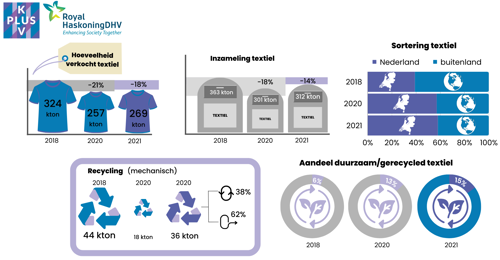 Ook is er in 2021 weer meer textiel ingezameld. Het merendeel wordt via gemeenten ingezameld, gevolgd door kringloopwinkels en andere alternatieve kanalen. Van de totale hoeveelheid afgedankt textiel wordt echter nog steeds een groot deel verbrand, terwijl de hergebruik- en recyclepercentages achterblijven bij de doelstellingen.