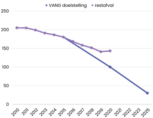 - De 30 kilo doelstelling laten varen, is volgens ons de beste optie. In feite is dit al geruisloos gebeurd met het Uitvoeringsprogramma VANG 2021-2025. Daarbij is de doelstelling aangepast naar 'beter scheiden' en 'verbeteren van de kwaliteit'. Helaas is dit minder concreet en minder SMART vergeleken met het nastreven van minder restafval.