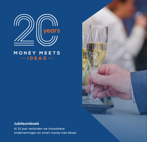 Ter ere van het 20-jarig jubileum bracht Money Meets Ideas een jubileumboek uit. Aan de hand van interviews, succesverhalen en veelzeggende foto’s werpen we een blik op de grondlegging van Money Meets Ideas, de ontwikkeling die het sindsdien heeft doorgemaakt, én de visie voor de toekomst. De rode draad hierin is de mate van innovatie die sinds de start onlosmakelijk verbonden is aan het Money Meets Ideas programma én bij de ondernemers die op het podium hebben mogen pitchen. Hierbij proberen we altijd aan te sluiten bij de ideeën en wensen van ondernemers en investeerders en bouwen we stap voor stap aan de impact en zichtbaarheid van het platform.