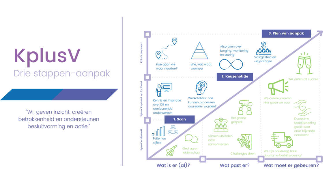 Nu we weten wat de vertreksituatie is, kunnen we die vertalen naar een realistische strategie en een concreet actieplan: de route naar een blijvend duurzame bedrijfsvoering. Met heldere doelen, prioriteiten en mijlpalen op weg ernaartoe. En het is niet ons plan, het is de routekaart van de mensen zelf, hoog tot laag, die erin geloven en samen een beweging willen starten. Onderweg bieden we coaching en monitoring, om te borgen dat de organisatie en de mensen op koers blijven en de vaart erin houden. Kortom, datgene wat blijkt bij te dragen aan verankering van duurzaamheid in de organisatie.