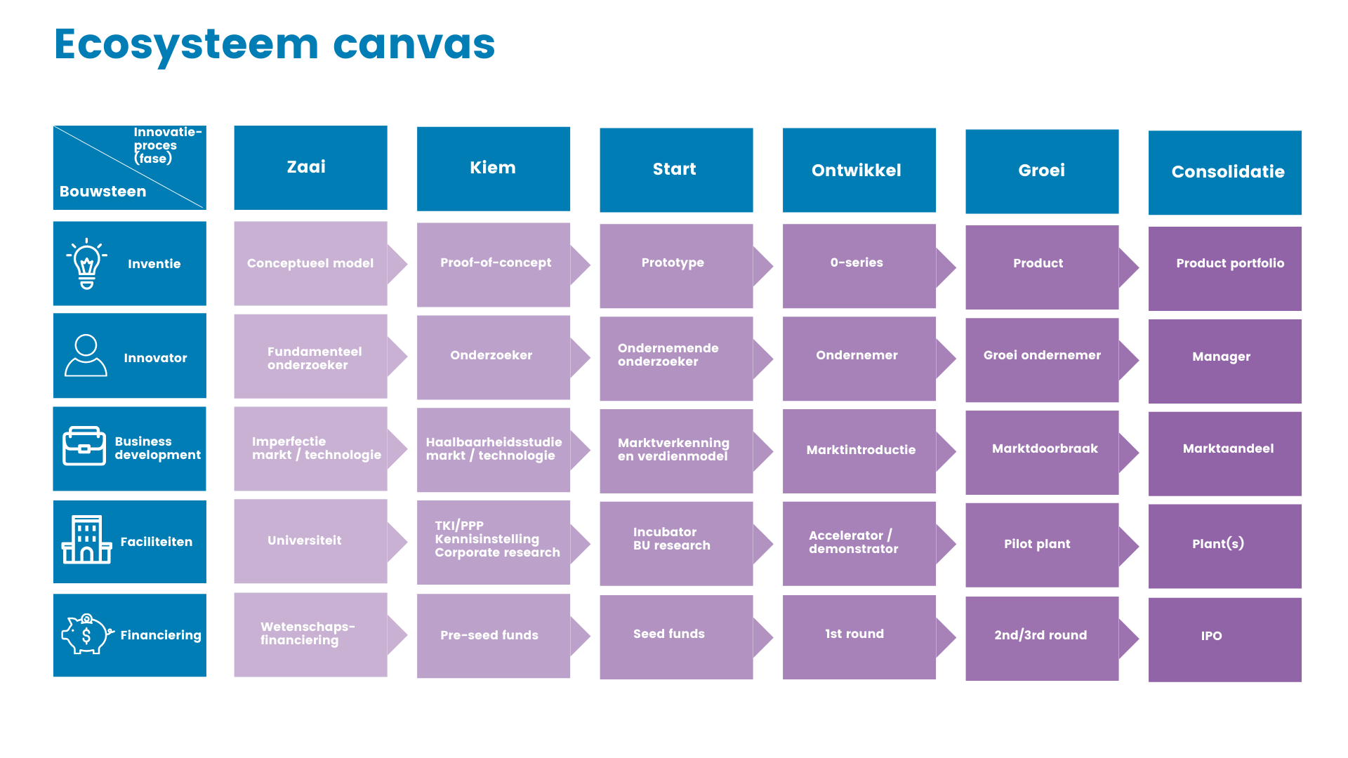 Ons Ecosysteem Canvas geeft per fase van het innovatieproces inzicht in hoe, met wie, met welke methodes, faciliteiten en financiering innovaties gerealiseerd kunnen worden door Privaat-Publieke Samenwerking: van inventie tot en met financiering en van de zaai- tot en met de consolidatiefase.