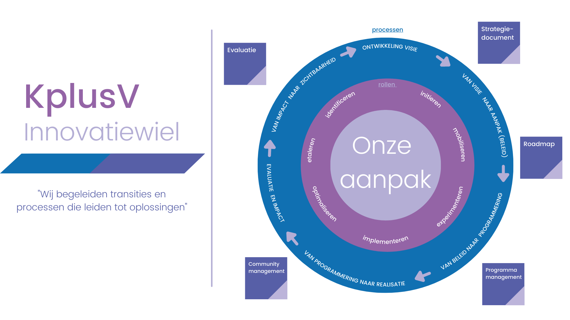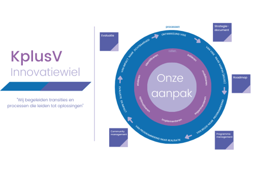 Ons Innovatiewiel toont onze aanpak voor initiëren, managen en evalueren van ecosystemen en Privaat-Publieke Samenwerkingen. Het maakt duidelijk welke rollen en processtappen nodig zijn, welke aanpakken we daarbij gebruiken en tot welke output dit leidt. Zo begeleiden we transities en processen die leiden tot oplossingen.
