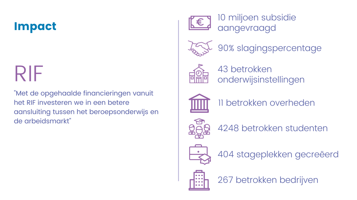 Het Regionaal Investeringsfonds mbo (RIF) investeert in de ontwikkeling van duurzame Publiek-Private Samenwerking, voor een betere aansluiting tussen het beroepsonderwijs en de arbeidsmarkt. Sinds de start van het fonds in 2014 hebben we 25 samenwerkingsverbanden van mbo-instellingen en bedrijven laten slagen.